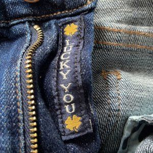 Ladies dark blue Lucky Brand “Sweet Straight” Mid-rise stretch cotton blend 5 pocket jeans. Iconic inner zipper “Lucky You” label. Some white wash whiskers.