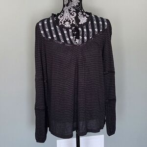 This is a blue Lucky Brand floral top with a ruffle sleeve. It has a keyhole in front with a neck tie. It is a cotton Modell blend. It is in good used condition. It is a women’s size large.