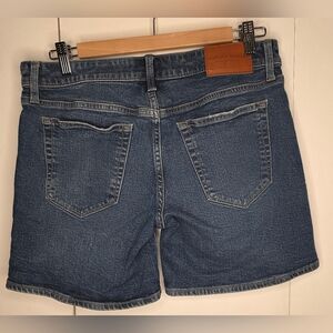 button up midrise shorts with distressing detail on left pocket. these shorts are worn in but not damaged.