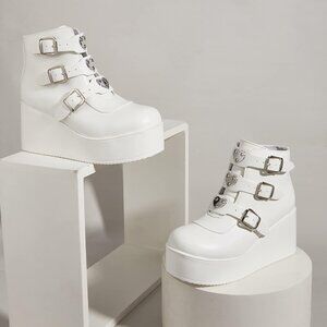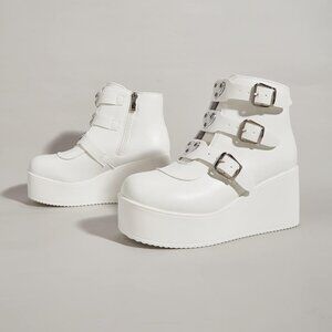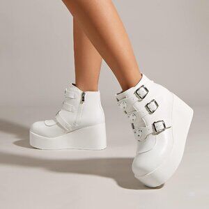 Lucky Step Women White Round Toe Zipper Wedges High Heel Rave Buckle Booties