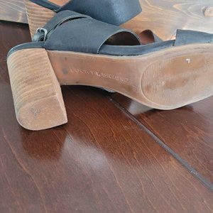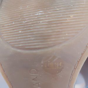 Classy looking sandal. Has a smaller wedge like heel with a strap that toes up around the ankle. Size 6.5 m in women's shoes.