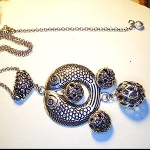 It features a lovely flower bail holding a very large 2 Coy fish pendant with ornate filagree ball dangles, One in the middle and three on the bottom, all in antique silver.