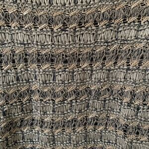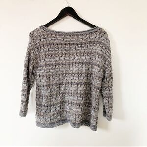 Knit sweater with mostly silver and gray color. There is a bit of beige in the mix. Silver thread is sewn throughout for a bit of sparkle. Scoop neckline and 3/4 length sleeves.
