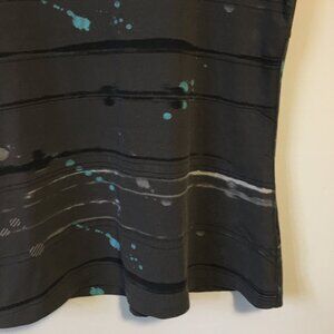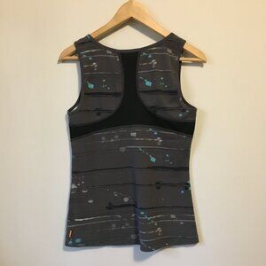 Good preowned condition, dark charcoal grey, racerback tank top by Lucy featuring an artsy abstract paintbrush and splash pattern with strokes and splatters in blue, white and black. Has a halftone filter applied to the print. A cool low profile piece.