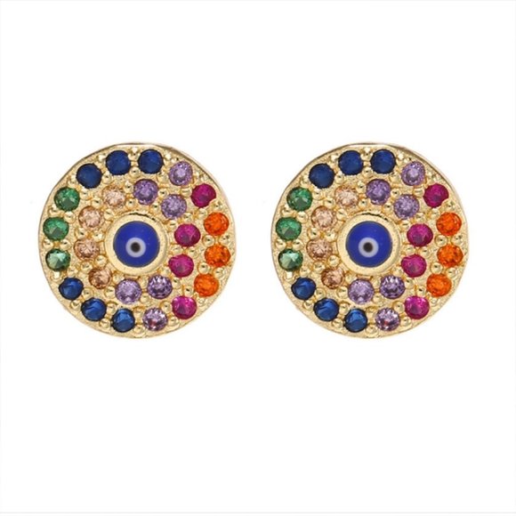 Keep good luck on your side with this simple yet very elegant pair earrings that are gold plating with coloured pavé rhinestones. They are inspired by the evil eye amulet symbol, which is believed to bring good luck and protect the wearer – making this an ideal gift for a friend or loved one. This chic and versatile earring and can go with any look. Multi coloured Rhinestones 14K Gold Plated Hypoallergenic, nickel free