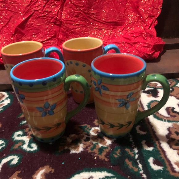 Enhance your dining experience with Lucy's vibrant green and blue ceramic mugs. These beautifully crafted mugs are perfect for savoring your favorite hot beverages. Their elegant design and sturdy build make them a delightful addition to any table setting. Made by Tabletops Galleries, these gorgeous cups are hand painted. 4 coffee mugs2 of one pattern 2 of another. Please check pics out, these are like new.