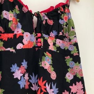 Black with red trim and floral detailing. Size L, fits small (like a medium).