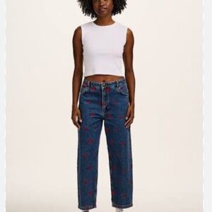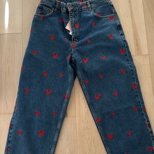 Drew - Cropped Straight Leg Denim Jeans in Mid Wash Blue with Cupid Hearts Embroidery - REG / W28 (UK 10) NWT