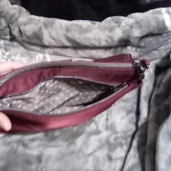 EUC pet and smoke free home. Front has a soft lined pocket with magnetic closures, one zipper pocket and a studded pocket with flap entry and magnetic closure. One large zippered pocket on the back. Interior of bag has two cargo pockets, one zippered pocket and one clearview pocket. The side has a hideaway pocket a bottle that snaps closed. FYI the bag's colour is a little darker than the photos show.