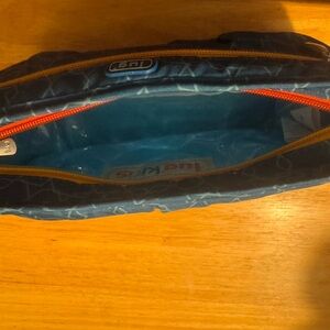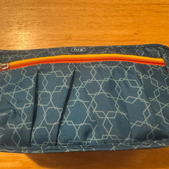This modern Lug toiletry bag showcases a striking geometric pattern in blue, complemented by a vibrant orange zipper. Ideal for organizing your essentials, it combines style and functionality effortlessly. Waterproof on the inside. Has been stored in a Rubbermaid container.