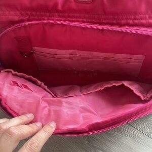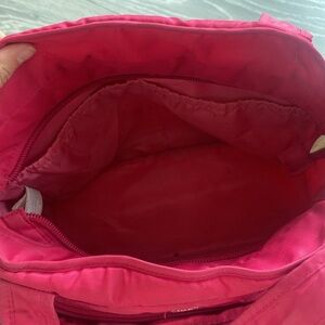 Stylish pink quilted tote bag by Lug. Features a spacious main compartment and front zip pocket. In used condition. Could use a trip through the wash but lots of life left!