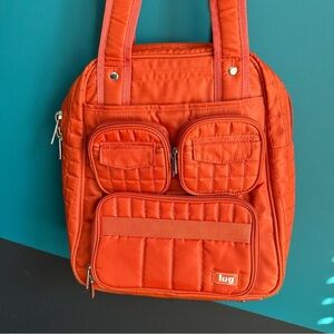 Vibrant orange quilted backpack by Lug. Features multiple front pockets for easy organization. Ideal for daily use.