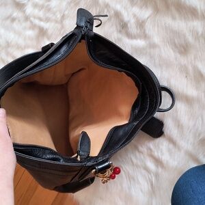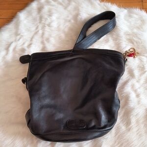 This Luigi Sciorio black leather shoulder bag features a slouchy design crafted from soft, matte leather. Its relaxed shape and prominent gold buckle detail make it a versatile choice for everyday use.