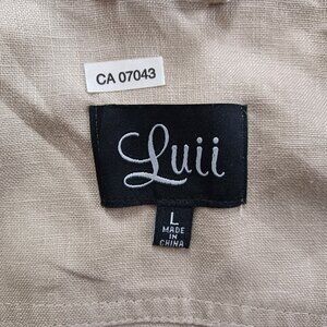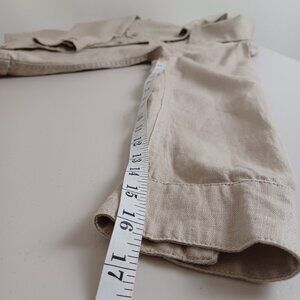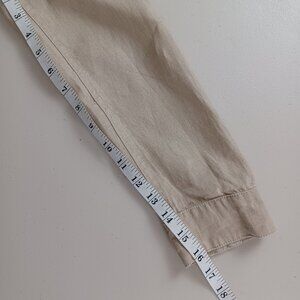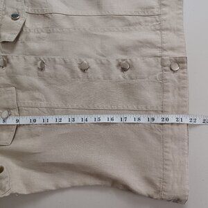 A lightweight button down shirt jacket in a neutral beige hue. Made from breathable, non-stretch linen. It has silver-toned buttons from top to hem and tab accents at the bottom. Can be worn solo or styled as a breezy layering piece. Perfect for spring and summer. Great condition.