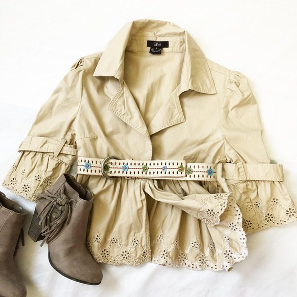 • Gathered peplum and sleeves with embroidered detail at hem.