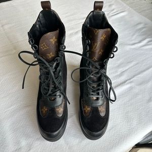 Details: This is one of Luis Vuitton's more coveted styles of boots. They are perfect for the fall and winter seasons. The have a platform which gives a little height. The leather ties in the front can be worn tied around the back of the boot and front again for a different look. They are a little roomier in the toe box area which is perfect for a winter boot (choose thin or thicker sock). They come with dust bags but no box.