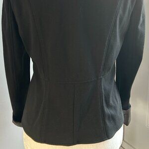 A sculpted Luisa Cerano moto: metallic-graphite coated front and collar balanced by soft black knit sleeves and back. Wear zipped on the inner or outer zipper for a narrower or easier fit; sleeves can be worn down or rolled to show the coated cuff facings. • Brand : Luisa Cerano. • Fabric : mixed media (metallic-coated woven front & collar; knit sleeves & back). • Color : black with metallic graphite front. • Size : No size tag. Best fits US 2–4 (approx. EU 34–36). • PTP measurement : approx. 18". • Fit note : close moto cut; knit sleeves/back offer light stretch—check PTP to confirm. • Condition : excellent. • Design details : stand collar; double front zips (can fasten on inner or outer track); chest zip pocket; two hand zip pockets; coated cuff facings; paneled back for shape; sleeves wear down or roll. Styled with accessories not included. Encore. Clothes worth repeating. #encorestudio #luisacerano #motojacket #mixedmedia #metallicblack #graphite #europeandesign #quietluxury
