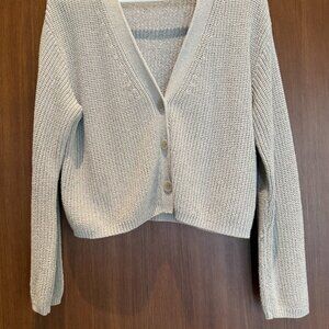 Classic cardigan with ribbed details in a glamorous shimmering yarn with a sleeve that elegantly covers the elbow.