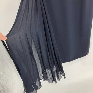 Beautiful sleeveless silk dress with a chiffon flare detail to one side, topped with a beaded floral embroidery at the hip. Back zip closure.