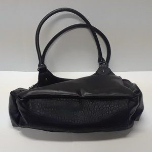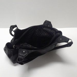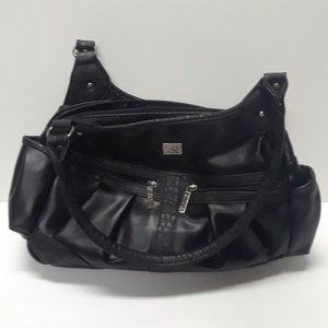Black faux leather Lula purse. A zipper for the main compartment and magnetic snaps for outer two compartments.