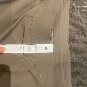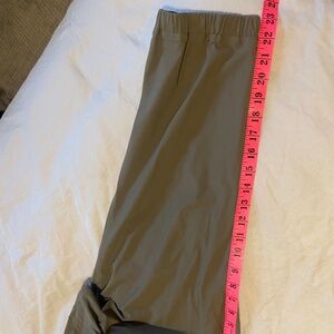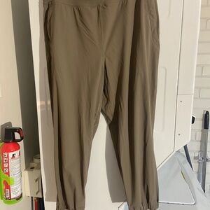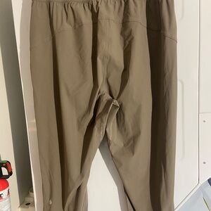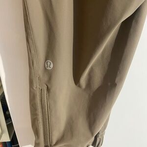 Lulu Lemon Adapted state high rise jogger cropped. Pants are light brown in colour ( Lulu colour Sheer Oak ) . They are size 10 with a 23" inseam. Drawstring closure at waist. Zippered pockets both sides. Cuffed and zippered bottoms at leg opening. Perfect condition.
