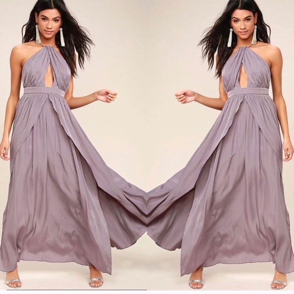 Lulus Exclusive! The On My Own Dusty Purple Maxi Dress is a party perfect look all by itself! Lightweight woven poly shapes a modified halter neckline with a front keyhole, and skinny straps that crisscross and tie at back. A banded waist tops a full maxi skirt with twin side slits and a ruffled overlay. Hidden back zipper/clasp.