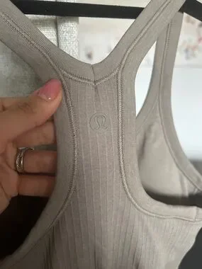 Soft ribbed racerback tank in taupe. Sleek fitted silhouette that layers easily. Stretchy knit for comfortable all-day wear. Versatile neutral that pairs with jeans or skirts.