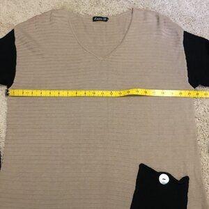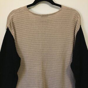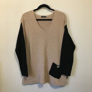 Very good preowned condition, beige ribbed, v-neck knit sweater with black sleeves by Lulu-Be. Pocket on the left side with a mother of pearl button. Lightweight, comfortable, and natural material.