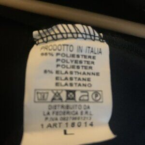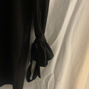Lovely black dress with ties on sleeves for extra detail. V neck loose fitting and comes kust above the knee. This is a Large but not a generous fit. It feels like silk on. It looks great with black tights. (Looks better when you see it)