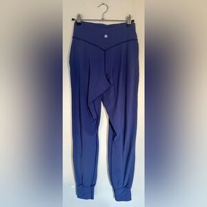 Lululemon high-waisted leggings in blue. Perfect for workouts or casual wear.