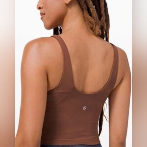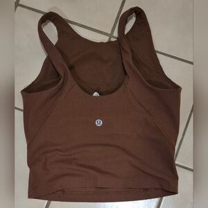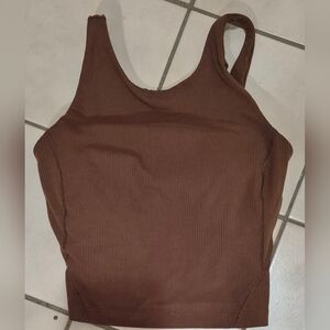 This brown tank top from Lululemon Athletica is sleeveless and features a fitted, cropped design that accentuates the body's shape. Made from a smooth, stretchy fabric, it offers a sleek and comfortable fit perfect for casual wear.
