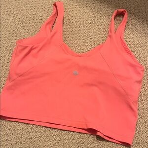 Sleek cropped tank with a flattering V-neck. Stretch fabric for a smooth fit. Bright coral pink color. Easy layering piece for workouts or casual wear.