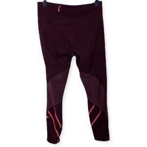 All Meshed Up 7/8 Running Tights by Lululemon in Bordeaux Drama / Flash Light and Women's Size 2. Has mesh fabric panels. Full-on luxtreme fabric. Sweat-wicking and four-way stretch. Breathable. Added Lyra. Reflective details for night running. Waistband pocket. 25" inseam. Style #W5J34S. Excellent pre-loved condition. No flaws.