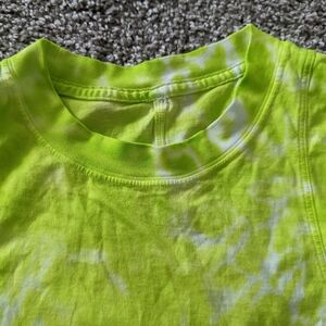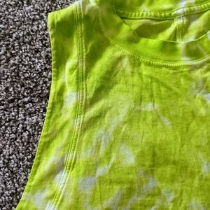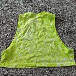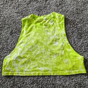 Really cute light green tie dye crop top! It has a high neckline, very wide arm holes, and a nice flowy fit. It's also pretty lightweight so conducive to lots of workouts and activities! size medium condition: like new