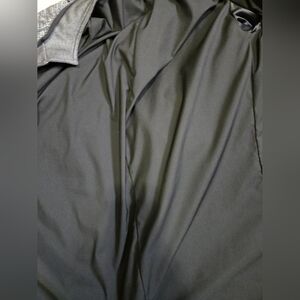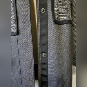 Grey cocoon car coat by Lululemon Athletica. Loose fitting design for after a workout or a trip to the store. Full front snapped closure. Two front pockets. Fully lined in a silky black.