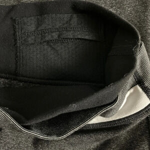 Pants are dark heathered grey, waistband is white, black and white striped and black.