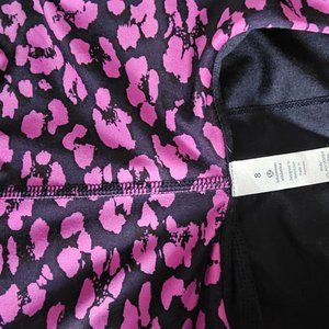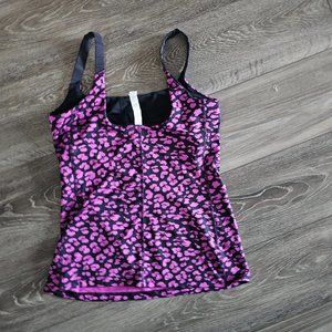 This Lululemon Barre None Tank in size 8 features a Mini Cherry Cheetah pattern with a scoop neckline and pullover closure. The sleeveless tank is made of Luxtreme material and has a fitted style, perfect for travel, activewear, or casual wear. The multicolor tank is suitable for outdoor activities, athleisure, and sports, with slimming, lightweight, stretch, moisture-wicking, and breathable features.