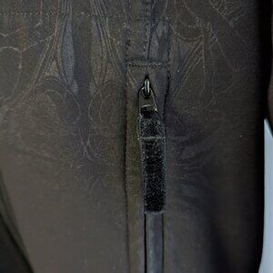 Wind and water-resistant, softshell fabric has four-way stretch, fleece fabric lining, loose fit, longer length, interior adjustable waist toggles, two-way zipper, interior media cord holder, hooded, Dance In Snow pattern, front zippered pockets.