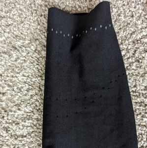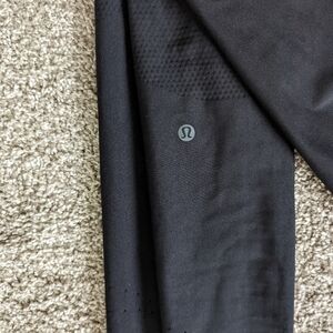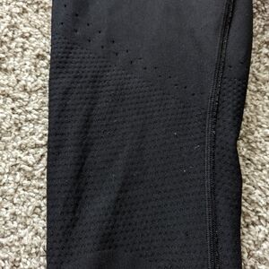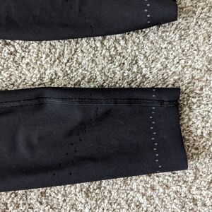 Cute pair of black leggings from Lululemon! They are black in color, has mesh panels on the front and back, and small reflective dots on the hem.