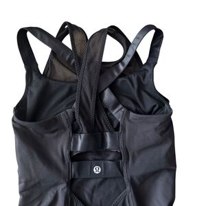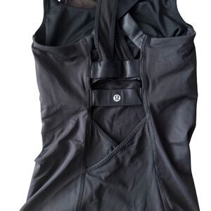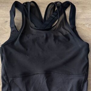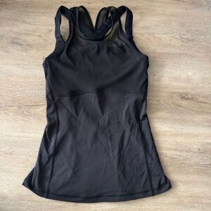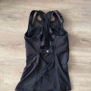 Lululemon black tank top, featuring a breathable mesh upper, sleek built-in bra, and statement multi-strap back. Flattering longline fit makes it perfect for training, yoga, Pilates, or layering on the go. Gently used and in excellent condition — no stains, holes, or pilling.