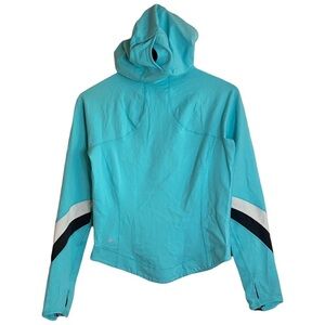 Lululemon Blue White Black Track Jacket Hood Ponytail Hole Thumbholes Pockets 8