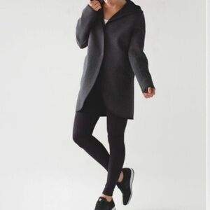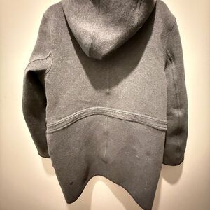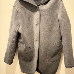 Stay cozy and stylish with this elegant gray hooded Spring Jacket . Perfect for layering and versatile for any occasion. The jacket is reversible black one side and grey on the other. The snaps are stunning on this jacket