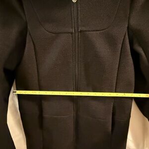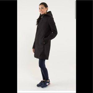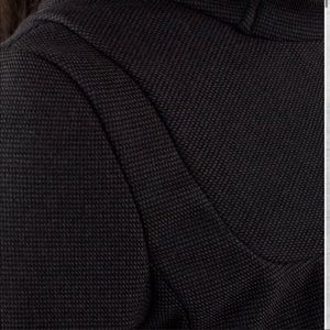 Warm, long, Softshell jacket with fleece lining and black/taupe tweed exterior. Zip pockets, adjustable hood and soft wrist cuffs. No rips, tears or stains. Size tag is missing and no size dot in pockets.