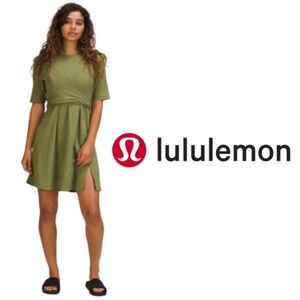 Stay effortlessly cool and comfortable in the Lululemon Cotton Wrap-Front T-Shirt Dress in Bronze Green. Designed with a soft, breathable cotton blend, this dress features a flattering wrap-front detail at the waist, adding shape and interest to the classic t-shirt silhouette. The relaxed fit and short sleeves make it perfect for everything from running errands to weekend brunches.