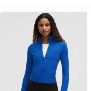 Stylish blue jacket. Full zip front. Long sleeves. Perfect for active wear.