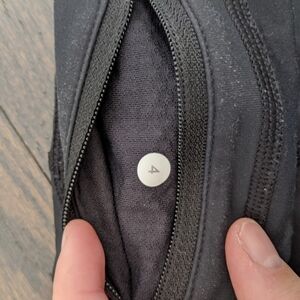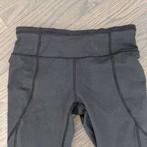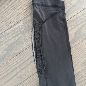 Cute black Lululemon cropped leggings with frill detailing on the side of the leg, a small zippered pocket on the back waistband.
