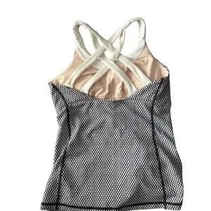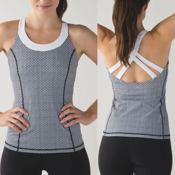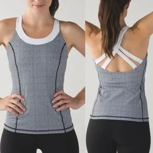 π This Lululemon Athletica tank combines style + performance, making it a must-have for your workout and athleisure wardrobe. Featuring a built-in bra, crossback strappy design, and a sleek black/white geometric print, itβs both supportive and flattering.