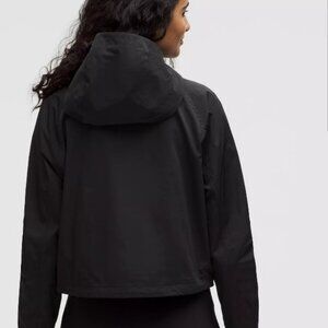 Nylon in dark navy, almost black. Flat front with side pockets. Hood, not detachable. Short style. New condition!