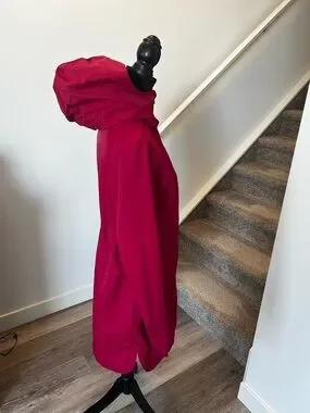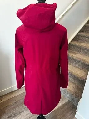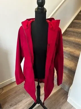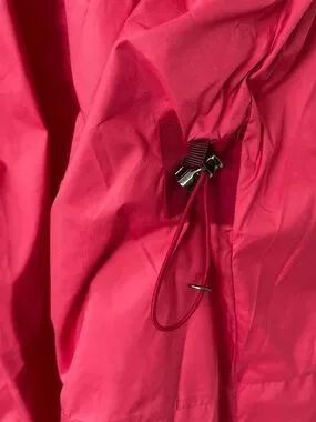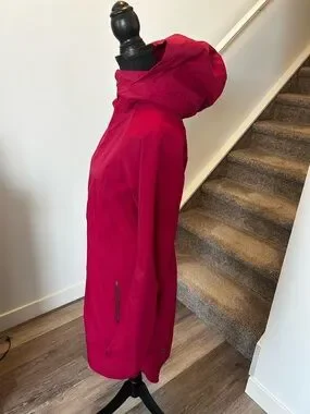 Lightweight hooded jacket in a vibrant berry pink. Water-resistant shell that shields from light rain. Zip-front closure and zippered pockets for secure storage. Longer silhouette provides extra coverage. Comfortable, versatile layer for everyday wear.