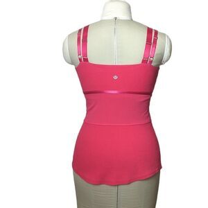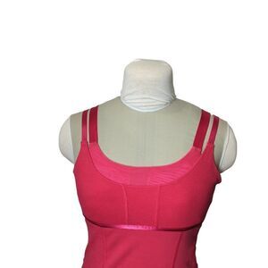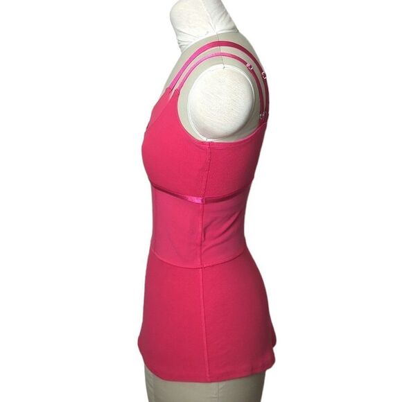 This is a fuchsia pink athletic tank top with contrast ribbed panels by Lululemon. Double straps and a built in mesh shelf bra that peeks out for a layered look.